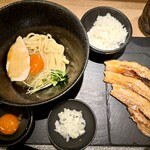 麺がモッチモチで小麦の味がして、おいしかった。 レモン、わさび、玉ねぎで味変したり、最後に残った汁でTKGにしたり、食べ方も楽しいです。