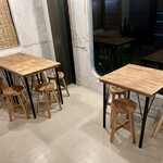 ビルの2階にある店舗は、大きな窓が目印。コンクリート打ちっぱなしの壁を活かしてリノベーションしたという店内は、お洒落で居心地の良い空間です。16名ほどがスタンディングで利用できる大きなカウンターの他、2~3名用と4~5名用のテーブルが2卓あります。
