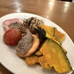 メニューは定番料理の「自家製イタリアハムとツナのソース」800円や、ワイルドな味わいの「手作りシューマイ」(2個・800円)、近所のイタリアパン専門店「PANIFICIO VIVIANI」のパンを使用した「鶏レバーパテとブルスケッタ」(1枚・650円)など、前菜からメイン、パスタまで和、洋、中とジャンルにとらわれない料理がそろっています。その日の前菜を人数分盛り付けてくれる「前菜盛り合わせ」も、いろいろな味を楽しめると人気のようです。