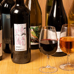 料理と一緒に楽しむドリンクも豊富で、なみなみ注がれる赤と白の「酒場的グラスワイン」800円は、同店の名物。最初の一口は、グラスに顔を寄せないと飲めないほど縁のぎりぎりまでつがれ酒好きにはうれしい限り。「クラフトビール」(650円~)や「自然派ワイン」(ボトル・4,000円~)は、テーブル横の冷蔵庫から自分で出して飲むスタイルで、好みのものを選ぶのも楽しいです。