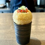 「ダルプリウプマ」はインドの軽食のパニプリをアレンジしたもの。サクサクで円形のプリ(生地を油で揚げて円形にしたインド料理)にウプマ(セモリナ粉を使ったインド料理)とカチュンバル(野菜のスパイスあえ)を合わせ、そこにダルをかけながら食べるというスタイルはモダンインディアンにも通じるものです。