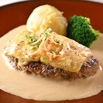 牛肉3豚肉1の比率の挽き肉を゙使い、1時間炒めた北海道産玉ねぎを合わせ、整えて焼いたハンバーグだそうです。