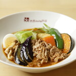 「豚角煮&ベジタブル」1,950円も人気で、使用する北海道日高産の神威豚は、冷めても硬くなりにくい肉質で、融点が低く、ほのかに感じる甘みなどがおいしい豚。豚角煮として仕上げ、特製のスパイスと煮込んでいます。角煮はスプーンで崩して食べられるほどの軟らかさ。豚角煮の甘みとスープの辛みのコラボレーションは癖になること間違いなしです。