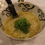 麺は京都「麺屋 棣鄂(ていがく)」の、しなやかでやわらかい細麺ストレートを1人前で40グラム使用する。特注の小さなラーメン丼にスープと麺を合わせたら、鶏のチャーシューと鶏そぼろ、九条ネギ、柴漬け、姫なるとをトッピングし、胡椒を回しかけ、有明海産の海苔をのせ完成だ。