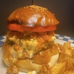 イチ押しは、厚切りの「コルビージャックチーズ」が2枚使われた「コルビージャックチーズ×チーズバーガー」。ステーキ肉をほぐしたような肉片の歯ごたえが絶妙な自慢のパティ、このパティを上下で挟むように使われているのがコルビージャックチーズです。