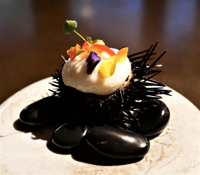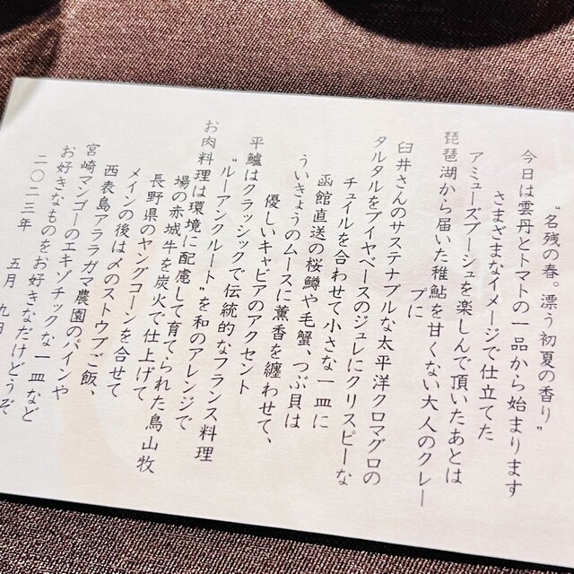 フランス料理には「ショープレート」といって、ゲストに見てもらうための飾り皿を準備する文化があるが、「シンシア」のコース料理では、このショープレートに1品目のスペシャリテ、ウニ料理を、お客様を精一杯もてなしたいという思いを込め石井氏が自ら運ぶ。食べ終わったプレートの下からサプライズ的に現れるのは、まるで手紙のようなコースメニューだ。