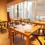 広々とした店内は『極上な日常』をテーマに、定番でも上質、日常だけど特別な居心地の良い空間になっています。昼間は大きな窓から明るい日差しが差し込み開放的に、夜は落ち着いたシックで上品な雰囲気で食事を楽しめます。一人で気軽にドリンクや軽食を楽しめるキッチンを囲むバーカウンターや、仲間との食事に最適なテーブル席など全45席。人の手を感じる左官仕上げのカウンターや木の素材、作り手の顔が見えるキッチン、カウンター上部のプレートの収納など各所に創業者のテレンス・コンランのエッセンスが詰まっています。