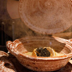 コースは全13~14品で構成される「おまかせコース」45,000円のみ。季節の厳選食材を使った、薪焼きの魅力が詰まったコースです。スペシャリテ「黒毛和牛ヒレ肉の飯蒸し」は、黒毛和牛の処女牛のみを使用し、ヒレ肉の中でもサシが少なく、赤身の強い部位を選んでいます。お腹がいっぱいになる前に食べて欲しいという思いから、コース前半に提供。厚みのあるヒレ肉は直火の遠火にゆっくりとかざして芯温を上げ、近火にして表面に焼き目をつけ、さらに肉を休ませた後、遠火の強火にして焼き上げています。仄かな甘辛の特製ダレが味の繋ぎ役。