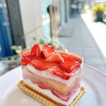 世田谷区南烏山にある「食べログ スイーツ TOKYO 百名店」常連の人気パティスリー「ユウ ササゲ」。こちらの「いちごのショートケーキ」は、スライスしたいちごを生クリームと3層のスポンジ生地でサンドしたもの。スポンジ生地にはちみつを加えているため風味がとても良く、しっとりした口当たりも好印象です。また脂肪分42%の生クリームはミルキー感があり、口の中で優しくすーっと溶けていきます。クリームの中にはスライスしたいちごがたっぷり入っていて、どこを食べてもいちごの存在感を感じられます。素材の一体感が秀逸で、何度でも食べたくなるおいしさです。