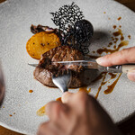 メインディッシュのおすすめは「A5ランク佐賀牛のロースト マッシュルームのソースと炭酸葡萄 竹炭塩のクロッカンテ」。以前、嶋脇シェフが働いていたレストランで和牛の食べ比べをした際、最もおいしかったのが佐賀牛だった。独立した際には、目玉メニューとして使うことを決めていたそう。しっとりとレアに焼き上げられ、火入れ加減は申し分ない。寒い季節にはマッシュルームのこっくりとしたソースがよく合う。