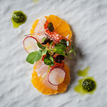 こちらにペアリングされるのは、イタリアのフリウリ・ヴェネツィア・ジューリア州のオレンジワイン。「オレンジワインですがタンニンが控えめで紅茶っぽいニュアンスです。すっとした味わいが甲殻類の入ったムースと相性がいいですね」と嶋脇さん。紅茶の風味がムースのいいアクセントになっていた。