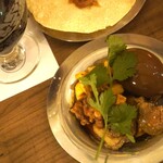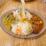 本日の「2種盛り」1,200円はムムムチキンとベジタブルコロンブ(コロンブとは南インドの汁物料理という意味合い)のあいがけ。こちらに「MIXきのこアチャール」200円と「ボー・ラロット」250円をのせ、別皿提供の「エビのマスタードマサラ」400円も注文しました。