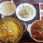 ビリヤニといえばライタが添えられることが多いのですがこちらはサラダとチキンスープ、そしてバラチャウン(ミャンマーのふりかけ)とマンゴーアチャール(インドのスパイス漬)という不思議な組み合わせ。