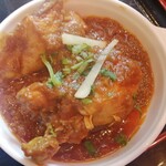 食べてみるとパラパラ感としっとり感が融合したビリヤニ。長粒種のご飯の中にスパイスで味つけられた骨付きチキンがゴロゴロと入っています。これはダンパウではなくビリヤニではないかと考えながら、付け合わせのバラチャウンをかけてみると一気にダンパウ感が出てくるのが非常に面白いと感じました。