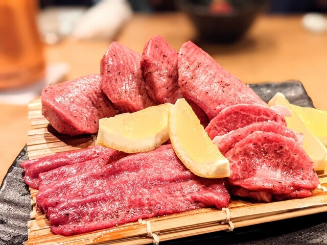 自分で焼くと焼きムラが出たり、焼きすぎて硬くなったり、もっともおいしいタイミングを逃しがちだが、中原氏をはじめ、肉のプロであるスタッフが一枚一枚ていねいに焼き上げてくれるので、どの肉も最高の仕上がりで味わえる。厚切りのタン元の表面はカリッと香ばしく、中心部はほどよいピンク色だが芯までしっかり熱が入っており、レモンと黒七味が肉のうまみを引き立てる。