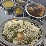トマトパップー(アーンドラ地方のトマト豆カレー)やブリンジャルヴェプドゥ(茄子のマサラ炒め)も単体でおいしく、メインのカレーと合わせても機能する名脇役ともなり、ご飯もシンプルなソナマスリと酸味が爽やかなレモンライスでそれぞれカレーの味の感じ方にも変化が出て、すべて頼んで正解でした。