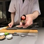 腕を振るうのは10年間懐石料理を学び、銀座の寿司の名店で11年修業を積んだ原口ツカサ氏。ミシュランガイド掲載の両店で勉強したことを自分の感性で表現したいと、慣れ親しんだ銀座という地で昔からの夢だった独立を果たしました。