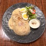 メインに頼んだのは「チキンビリヤニ&コルマカレー」1,950円。こちらはコルカタ式のチキンビリヤニにバングラデシュスタイルのミルキーなコルマカレーをかけ、サラダとライタをワンプレートにのせて見た目も華やかな仕上がり。