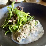 前菜におすすめのワインはフランス・アルザス地方のスパークリングワインであるクレマン・ダルザス。「こちらはボリューム感をおさえてすっきりしたスパークリングワインで、カニやコンソメのジュレにとてもよく合います。1杯目としてスムーズに口に運びやすいワインです」とソムリエの佐藤さん。ほどよく引き締まった味わいだが、コクや苦みはしっかりあって、前菜にきらびやかさを与えていた。