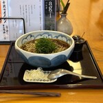 採れたての新そば、水分量の多い上質なそば粉を厳選し、粗く細かく独自のスキルでブレンドしてひいた、絶妙なバランスのしっとりとした石臼挽き十割そばが特徴。そばの香りと旨みを最大限に活かすよう、火力の強いコンパクトな釜で25秒ほどササッと湯がく、鍛錬された手捌きは必見だ。自ら薄く削る鰹節をメインに、10年ものの利尻昆布、椎茸ベースの出汁と寝かせないフレッシュな醤油を軸にした、コクのあるクリアなかえしに、オリジナリティあふれるこだわりを発揮する。そば湯を入れたそばつゆをお供に、最後はまたお酒を飲むのも通だとか。