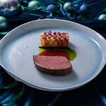 ヴィーガンコースのメイン。椎茸にすりおろしたレンコンを詰めて蒸し、シャンピニオンデュクセル、レンコンチップ、ごぼうを添えた。ソースはキノコ。肉厚な椎茸を頬張れば、驚くほどジューシーで、レンコンチップやごぼうの食感も楽しい。満足度の高いひと品だ。「ヴィーガンといえども、素材をいくつも重ねたら誰でもおいしくできるので、素材を可能な限り減らし、それらの良さをどう引き出すかを考えています」と優貴シェフ。