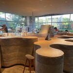 店舗全体のカラーを古くからある街になじむようなアースカラーに統一。地層をイメージしたという曲線を多用したデザインがカウンターテーブルや天井装飾に用いられ、自然の中にいるような温かみのある空間になっています。
