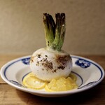 ジャスミン米、百合根のリゾット – ジャスミン米と日本米をかけあわせたプリンセスサリーという米と月光というブランドの百合根。百合根を丸ごと焼いてからほぐして、周りの焦がした香りとカリカリ感に中のしっとり感、少し柔らかく仕上げたリゾットの上品さに悶絶