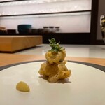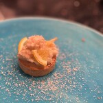 間接照明が大人の雰囲気を演出するバーカウンターでいただけるコースは、ランチ5,500円~、ディナー7,700円~。デザート同様、見た目も美しく繊細で、オリジナリティにあふれた料理の数々を楽しめます。コースは前日までの完全予約制です。