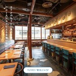 店舗全体のカラーは古くからある街になじむようなアースカラーに統一。地層をイメージしたという曲線を多用したデザインがカウンターテーブルや天井装飾に用いられ、自然の中にいるような温かみのある空間になっています。