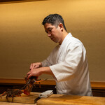 料理は昼夜共におまかせ(約10品 昼22,000円、夜27,500円)のみ。素材自体のおいしさを引き出すシンプルな調理を心掛ける。だからこそ素材は選び抜き、現地調達も多いとのこと。「開店前には1カ月、氷見に行って仲買の仕事をしました。船にも5日間乗って、船上でのブリの血抜きなど漁師の仕事を見てきました」という。素材への探求心は常に欠かせない。