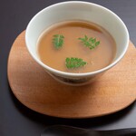 出汁が一口目の淡さから椀種と一体になってゆく流れが素晴らしい。じっくり味わって飲み、ゆっくりと変化を楽しむのがおすすめ。