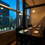 店名は「人の寝る場所や自分の家」という意味を持つ「塒(ねぐら)」。新店舗は東銀座駅を出てすぐで、銀座駅からも程近い好立地ながら、大人の隠れ家感があります。「しぶきアート」のテーブルや小物が彩る和モダンな空間で、天井が高く開放感もあり、居心地よく食事の時間を楽しめます。テーブル席の他、銀座の夜景も見える8名まで利用可能の個室も完備。全18席の店内は12名以上で貸切もできます。接待や会食、デートや記念日など、さまざまなシーンで利用できます。