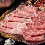 同店の和牛A5サーロインは雌牛にこだわって限定で仕入れています。その理由は、雌牛の脂の溶ける温度が低く、口に入れるとすぐに溶け、その溶けた脂が肉のエキスと混ざりあい舌の上でまろやかな味わいを醸してくれることで、肉の旨みや甘みを感じることができるから。コースは5,995円のものから用意していて、いずれのコースも「しゃぶしゃぶ」か「すき焼き」かを選べます。