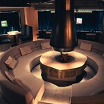 カフェがあるのは恵比寿駅西側、徒歩3分ほどの場所。代官山へ続く大通りから1本入った通りに立つビルの2階にあります。モダンなイメージのエントランスを抜けると、中央に暖炉を取り巻く円形のソファ席があり、更にその周りにソファ席、フラットシート、半個室などが並び、くつろぎの空間が広がっています。席数は11卓、26席。さまざまなタイプの席があるので、おひとり様から子ども連れまで楽しめそうです。