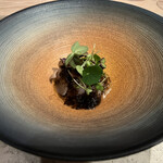 前菜の1品目は新湊漁港「孫七・川田水産」のブリを乾燥熟成させ、うまみを凝縮し、タルタル仕立てにしています。すりおろしたワサビと香草のクリームソースに自家製の葉ワサビオイルをかけたソースが圧巻の味わい。田中シェフが自ら山に入って摘んできた葉ワサビの独特な風味は体の細胞が活性化するかのように浸透していきます。ペアリングにはドライフルーツのようなフレーバーとミネラル感が特徴的な「アッサンブラージュ3」を。重力を感じさせない軽やかさがありながらも力強く、すべての感覚が滑らかに調和します。「アッサンブラージュ3」は1と2を経て、“IWA 5の方向性”が見えた大事な酒であるとジョフロワ氏。