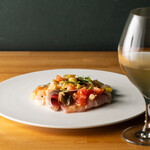 魚料理のおすすめは今が旬の初鰹を使った一皿。「身が締まってさっぱりした初鰹はふきのとうのソースで春らしく苦みを添えています。レンコンやうるい、菊で華やかな盛り付けにしました」と渡辺さん。見た目からも季節が感じられる一皿で、春が舞い降りてきたようだった。
