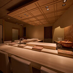 高級感のある店内は、明るく落ち着きのある雰囲気です。客席はライブ感を楽しめるL字形のカウンターに8席で、ゆったりと食事を楽しめます。