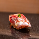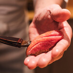 メニューは「おまかせ」27,500円。江戸前寿司のおいしさはもちろんのこと、丁寧に作られた一品料理も素晴らしく、最後まで期待を裏切らないコースになっています。豊洲で目利きが厳選した食材を使った、全21品を提供。千葉県の樽仕込み赤酢を使用したシャリは、まろやかですべてのネタにバランス良くなじみます。マグロ仲卸「やま幸」のマグロやウニ、季節ごとの旬の魚を使い、他店とは一味違う工夫を凝らしているのも同店の魅力です。