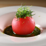 ククゥーでまず頼みたいのは、名物でもある「カニを詰めたトマトのファルシ」。コーダリー時代からの名物を近藤さんがアレンジしたもの。皮を剥いたトマトにかにサラダが詰められているのは同じだが、爽やかなバジルソースが敷き詰められているのが特徴。「ありがたいことに昔からの常連さんもいらっしゃいますが、みんなこれを目当てにするほど人気の一品ですね」と近藤さん。