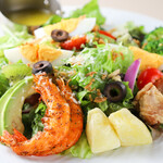 「FAMiRESサラダ」1,408円は、メインでも食べられるようなボリュームのあるサラダ。アボカド、トマト、ソフトシェルシュリンプ、じゃがいも、ベーコン、からあげ、ゆで卵、チーズなどの具材がゴロゴロ入っています。