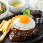 『ハンバーグはボリュームもしっかりで肉感もありそして目玉焼きもちょうど良い焼き加減(さすが!!)。