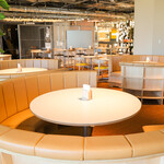 ひとりでもグループでも利用しやすく、誰もが居心地の良さを感じられる空間をイメージして、内装はスキーマ建築計画に依頼。象徴的に設置された円形のボックスシートのほか、テーブルや窓際のカウンターなど、バリエーションに富む全99席を設けています。