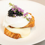 看板メニューの「イトシチュー」4,180円は、カウンターメインの同店ならではの、目の前で仕上げるスタイルで提供します。「男爵のガレット」1,980円は、北海道男爵芋を薄くスライスし、何層にも重ね食感にアクセントを出しています。誰が食べてもおいしい素材の組み合わせでまとめている一皿です。