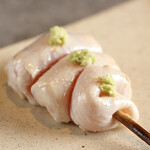 『最初にコースを3,000円~5,000円でお願いして、その後追加をしていくスタイルです。私は10本5,000円のコースをお願いしました。様々な地鶏を使っていきたいとのことでしたが、この日は熊野地鶏。普段はあまり食べない種ですが、肉の旨味に厚みがあるタイプ。比内と似た雰囲気の鳥ですね。