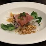 『頼んだメニューはまず天津四種。頼んでよかった! 四つともこの後を期待させる美味しさ。次に汁なしラージャー麺。大三元時代のスペシャリテとのことだったが、私は恥ずかしながら初対面。カイワレとの相性が抜群で、ピリ辛な口の中を潤してくれる。これは、美味い。次は炒飯で〆るつもりだったが、ここにエビマヨを。これが大正解。ぷりぷりのエビにセロリの爽やかさが相まって、最高。そして、五目炒飯。五目はエビ、カニ、チャーシュー、シャケ、卵だろうか。豪華な五目だ。これもまた美味。最後に杏仁豆腐とマンゴープリンをいただきました。特にマンゴープリンが絶品』(イチロマルディーニさん)