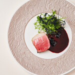 仕上げに添えたディルの花は、黒田シェフの両親が栽培するもの。合わせるワインは、フランスのロワール地方で、夫婦で営むワイナリー、リズ・エ・ベルトランの「ジュセ プルミエ ランデヴ」で、ワインが持つジャスミンのようなニュアンスが、コクの中にも爽やかさを感じる甘夏のソースと重なり合う。