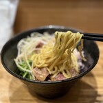 その注文のラーメン、まずはどっさりのった、甘めのタレで調理されているお肉。このお肉が本当に美味しいです!かき混ぜながら食べていきます。その下に隠れている麺の方は、中太でコシのあるタイプの麺。こちらも自分好みで良い味わい。全体的に甘味のあるまぜそばと思いました』(グルテツさん)