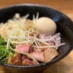 いただけるメニューは、鶏油や牛脂のうまみを生かした絶品タレでいただくまぜそばです。一番のおすすめは「特製地鶏まぜそば」。麺はラーメンの名店御用達の「三河屋製麺」の縮れ中太麺。具材には、特製タレに漬けこんだ後、低温調理し、オーブンで焼き上げた地鶏チャーシューを使用。ゴロッと食べ応えがあるチャーシューはジューシーで肉のうまみたっぷりです。このほか揚げた鶏皮、紫玉ねぎ、白髪ねぎ、かいわれ大根、味玉などがトッピングされています。