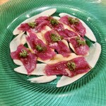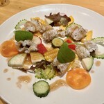 「いたや貝パクチーのカルパッチョサラダ」は、魚醤、レモン、パクチー、茗荷,赤パプリカ、揚げワンタン、玉ねぎ、ナッツが入っていて、それぞれのバランスがいい。