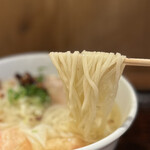 スープは丸鶏、牛、豚、貝、鰹節などかなり複雑な出汁の引き方。そこに数種類の塩を効かせているのですが、飲んでみて驚きました。飲み始めは塩味が少し物足りなく感じるほどギリギリまで抑えられており、出汁の旨みを上手く引き立てています。ここまで塩味を抑えて旨さを感じる塩ラーメンは初めてかも。